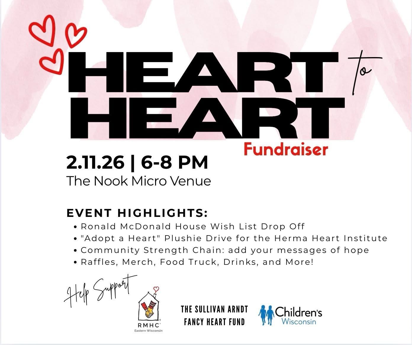 Join the Sullivan Arndt Fancy Heart Fund to support RMHC Eastern WI and Children’s Wisconsin at their Heart to Heart Event at the Nook Micro Venue on February 11th. For the Arndt Family, these kind of events are always extra special and they are excited to host this one in a new space with a fresh feel, while keeping the heart of what their mission has always been—supporting fancy hearts and the organizations that have meant so much to them over their own heart journey. Consider donating wish list items, sending a message of hope through the Community Strength Chain, or join in on the fun with the amazing raffle packages and merch for sale!