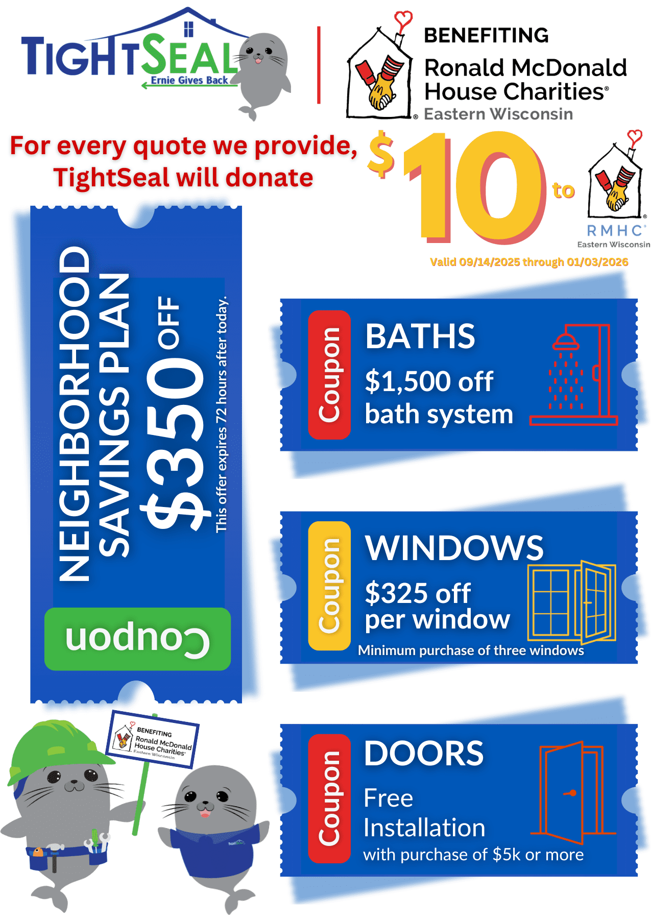 Our friends at TightSeal have chosen RMHC Eastern Wisconsin as their Benefiting Charity for their Ernie Gives Back Campaign! From September 15th through January 3rd, TightSeal will be offering $10 to RMHC for every quote they provide. They will also be collecting Wish List Items for RMHC families. Help TghtSeal reach their goal and help keep families together!